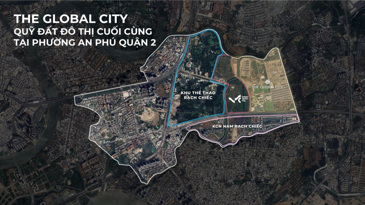 The Global City – Masterise Homes tọa lạc tại vị trí kim cương của phường An Phú, TP. Thủ Đức, thừa hưởng “đặc quyền di chuyển” đến các cao ốc, tuyến đường huyết mạch, tuyến metro của thành phố. Có thể nói, đây là “Mãnh đất VÀNG” cuối cùng với quy mô lên đến 117,4 ha có vị trí ngay lõi trung tâm Quân 2 – TP. Hồ Chí Minh.